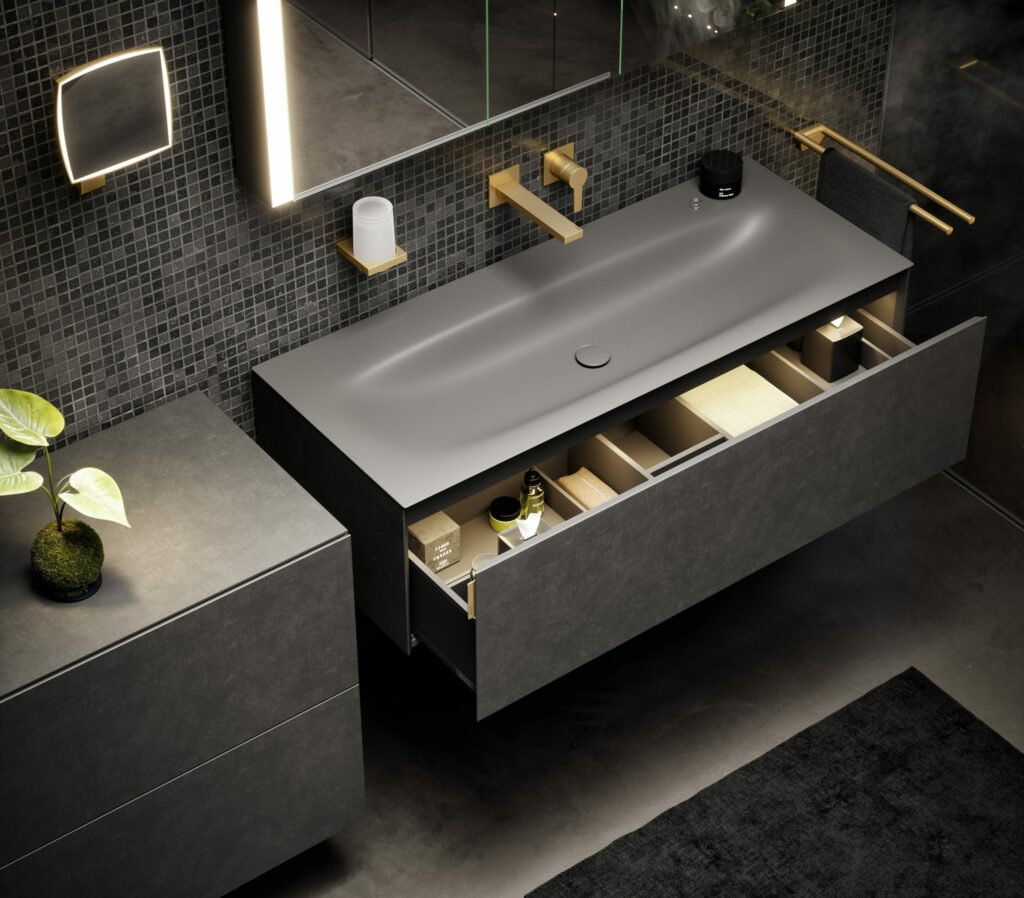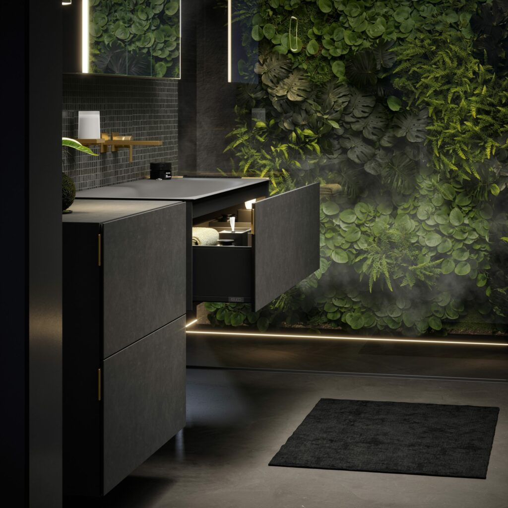 Das durchdachte Farbkonzept der EDITION 11 ART setzt sich nicht nur in den großen Designelementen fort, sondern reicht bis ins kleinste Detail. Der seitliche Griff an den Möbeln ist in den gleichen Oberflächen erhältlich wie verschiedene Armaturen und Accessoires von KEUCO: in Rotgold gebürstet, Messing gebürstet, Titanschwarz gebürstet, Aluminium-finish und Edelstahl-finish, bis hin zu tiefem Schwarz matt oder verchromt. Mit den darüber hinaus verfügbaren PVD-Oberflächen entsteht eine durchgängige visuelle Linie, die das gesamte Badezimmer aufwertet.